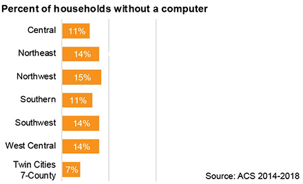 By region across the state, the northwest region has the highest share of households—more than a third—without internet, followed by the northeast, southwest, and west central regions, where a quarter of households do not have internet. By comparison, 13% of households in the 7-county Twin Cities region lack an internet subscription or computer in their home.