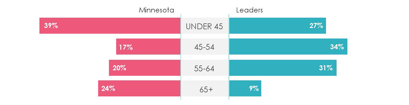 Two-thirds of Minnesota's leaders are middle-aged, while younger and older adults are underrepresented among Minnesota's leadership